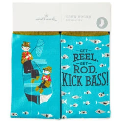 - Novelty crew socks feature an illustration of two people fishing and a punny message.