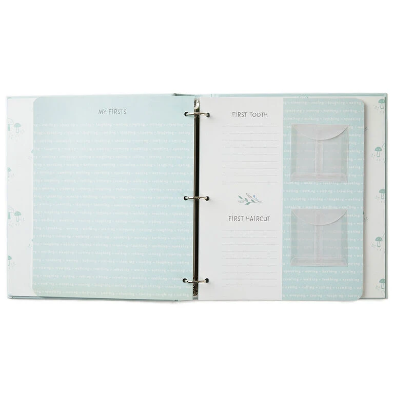 - Hardcover three-ring binder baby book features sweet lamb design on cover.