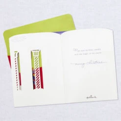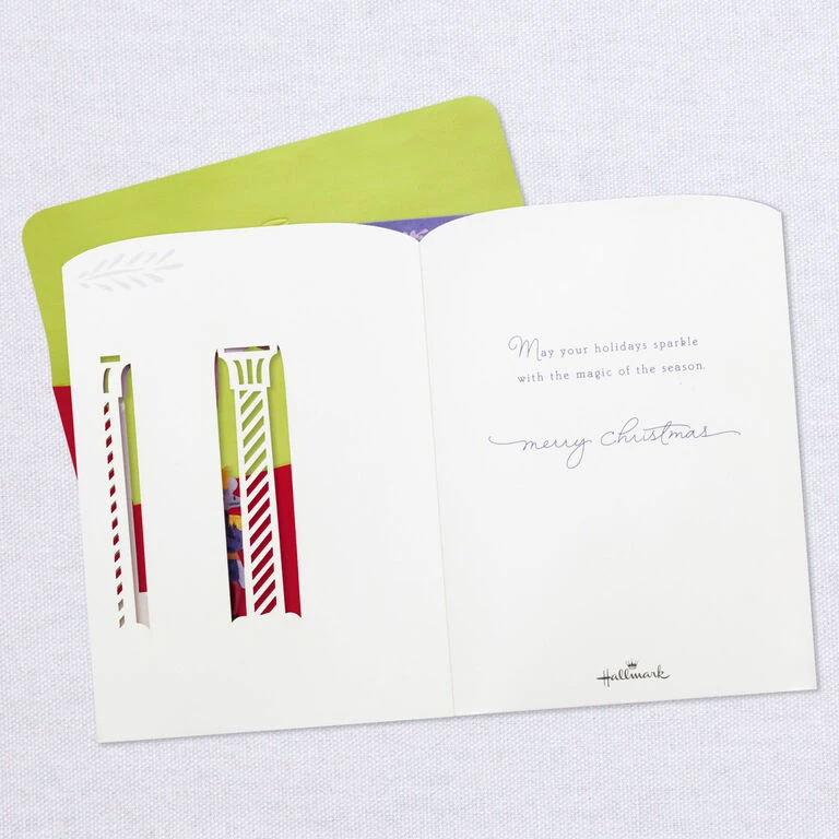 Pop-up Christmas greeting card features a scene from “The Nutcracker” ballet with a light-up backdrop set in a three-dimensional, laser-cut diorama. Musical card plays the song “Dance of the Sugar Plum Fairy” and lights up when button on front is pressed. Delicate die-cut details adorn the sides to extend the shadow box scene and create a lovely display from any angle. Simply unfold the card to create a peek-through shadow box display—no assembly required. When open for display, 3D pop-up card measures approx. 6″ H.