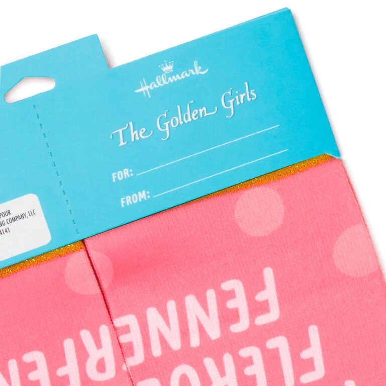 Keep your feet warm and dry in St. Olaf-style weather when you don this pair of adult-size crew socks featuring an illustration of Rose Nylund from “The Golden Girls.” A funny quote and polka-dot design on a pink background with gold cuff and toe complete the fabulous footwear.
