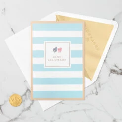 Pop-up anniversary greeting card features colorful flip-flops and sky-blue stripes paired with a “Happy Anniversary” message on the front. Simply open the card to reveal the 3D pop-up surprise inside—no assembly required: a beach vacation scene pops out filled with intricate, laser-cut lounge chairs, a striped umbrella, palm trees and tropical drinks. Die-cut details and sparkly glitter accents add a fun touch. This exquisite card crafted from premium card stock is a work of art sure to be displayed all year long, making it an unforgettable way to share your love on your anniversary or send happy anniversary wishes to a special couple. When open, this pop-up card lays flat for display; 3D pop-up inside measures approx. 3.25″ H.