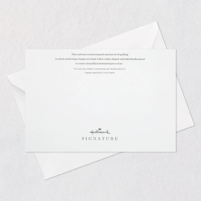 Love greeting card features a handmade “Love” message in red paper-quilled script. Greeting is a work of art that displays beautifully in a 5×7 frame (sold separately), making it an unforgettable way to share a romantic message for their anniversary, birthday and more. Crafted using the ancient art of quilling, in which small strips of paper are hand-rolled, coiled, shaped and individually placed to create a beautiful and detailed piece of art, this Hallmark Signature card was designed in collaboration with Quilling Card LLC, a company seeking to promote the art of paper quilling.